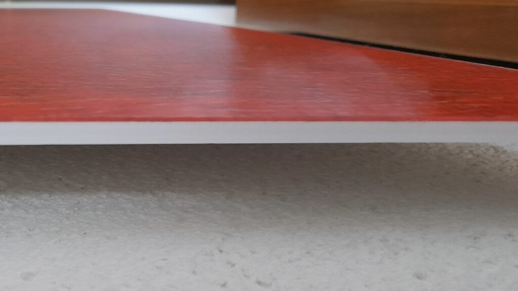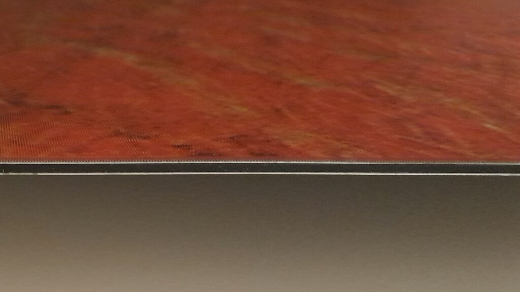 Die Lentikulardrucke werden anschließend entweder auf Forex (weiße feine Vollkunststoffplatten) oder Dibond (dunkle Verbundplatte aus Alu-Kunststoff-Alu) aufgezogen und mit einem quadratischen Distanzrahmen versehen, der das Bild 12 mm von der Wand abhebt.